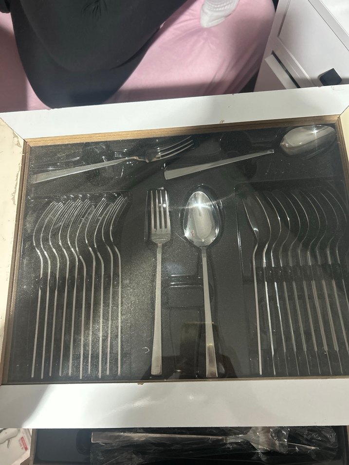 Gri ve beyaz renklerde, şık tasarımlı çatal ve kaşık seti, düzenli bir kutuda yer almaktadır.