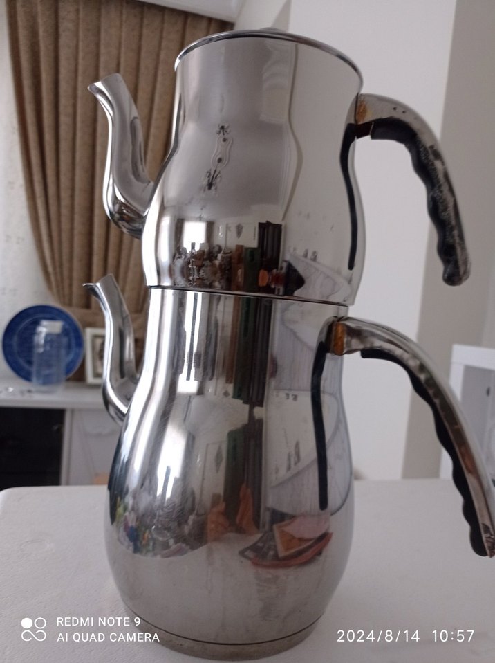 Gri ve beyaz renkli çelik çaydanlık seti, ergonomik saplara sahip üst üste iki parçadan oluşur. ☕