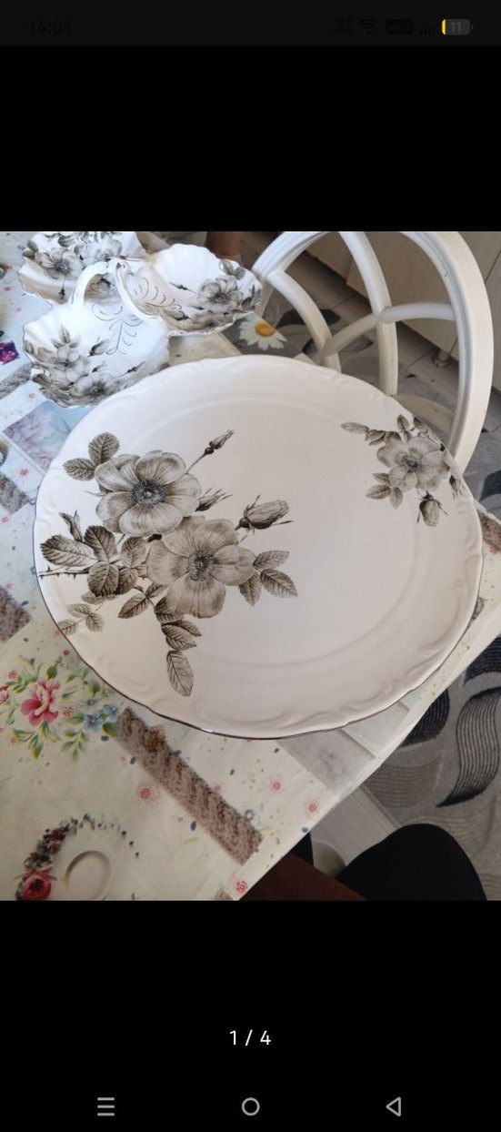 Gri çiçek desenleriyle süslenmiş beyaz tabak, ince kenarlı ve şık tasarıma sahip, yemek servisinde kullanılabilir. ️ Pasta Altiği