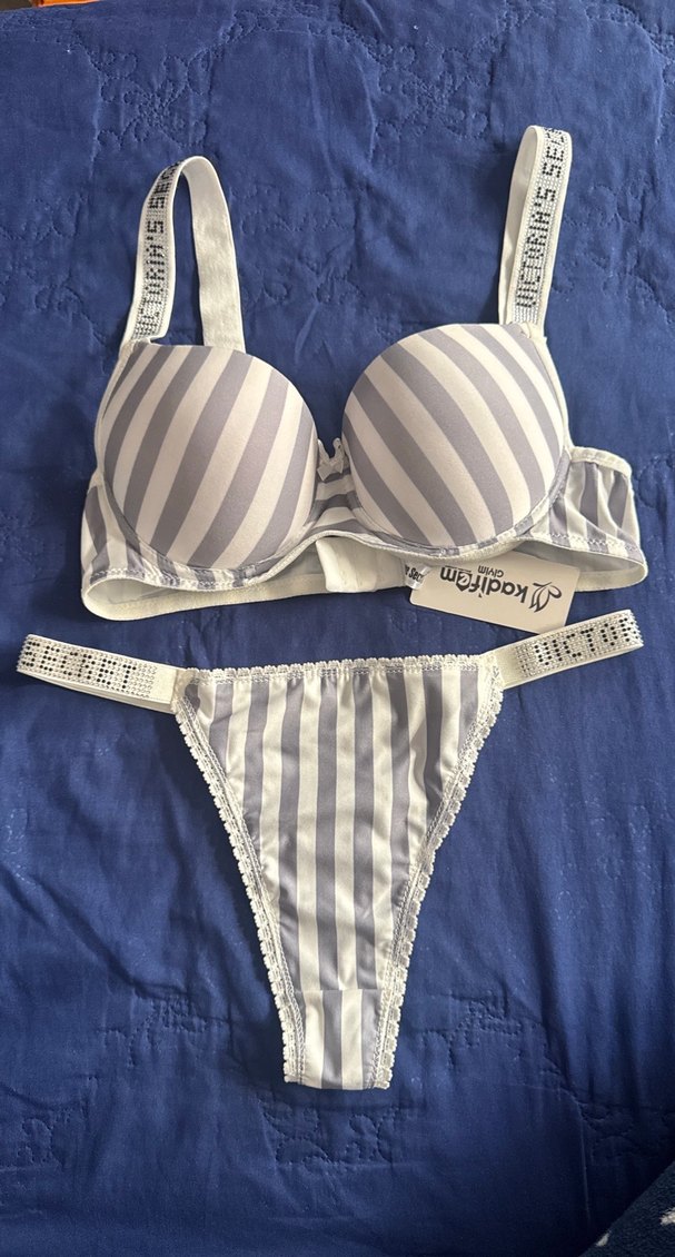 Paris tarzı sokak giyimi gri beyaz çizgili dolgulu sütyen takımı. Ayarlanabilir askılar, dantel ve taş detaylı alt kısmı ile tamamlanmıştır.