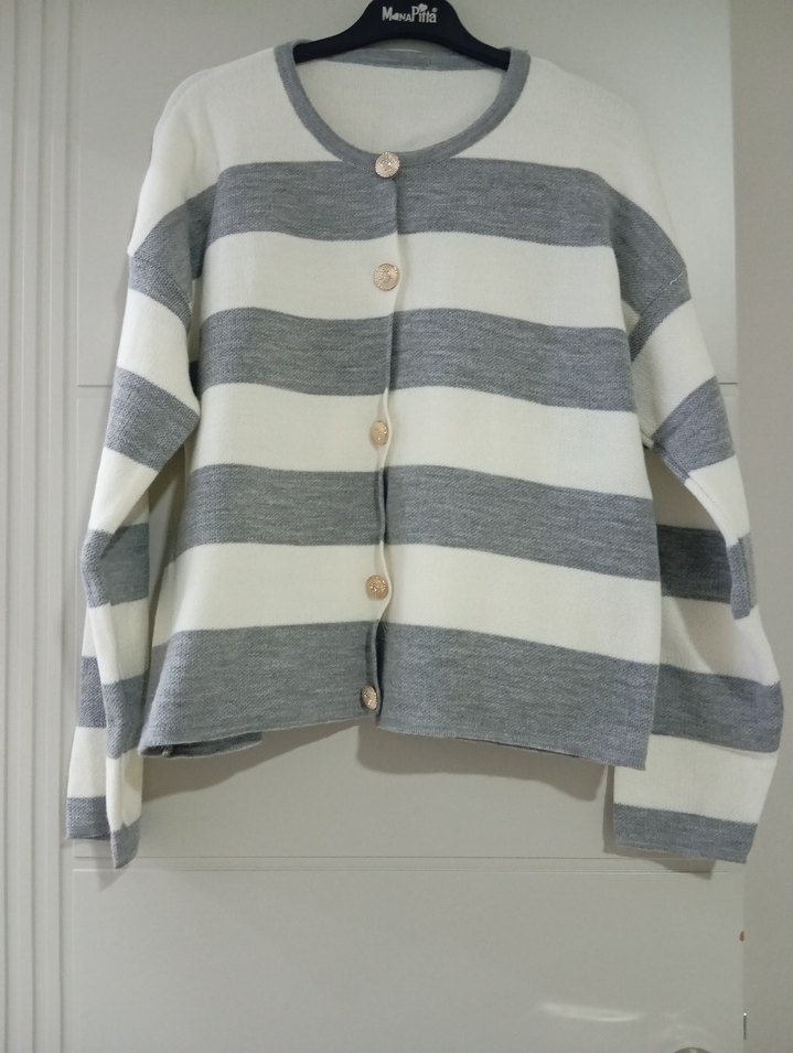 Gri Beyaz Çizgili Düğmeli Kadın Hırka