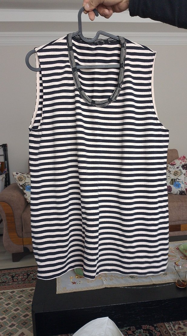 Gri ve beyaz çizgili, kolsuz, tekne yaka ve bol kesim kadın midi yelek. Tekstil kumaştan, günlük kullanıma uygun, zahmetsiz şıklık sunar.