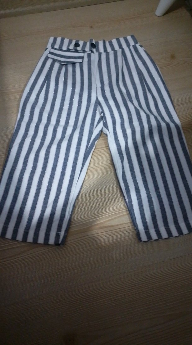 Gri beyaz çizgili, midi boy, regular fit kadın kumaş pantolon. Pileli ve küçük ön cepli, günlük rahat sokak stili için uygun.