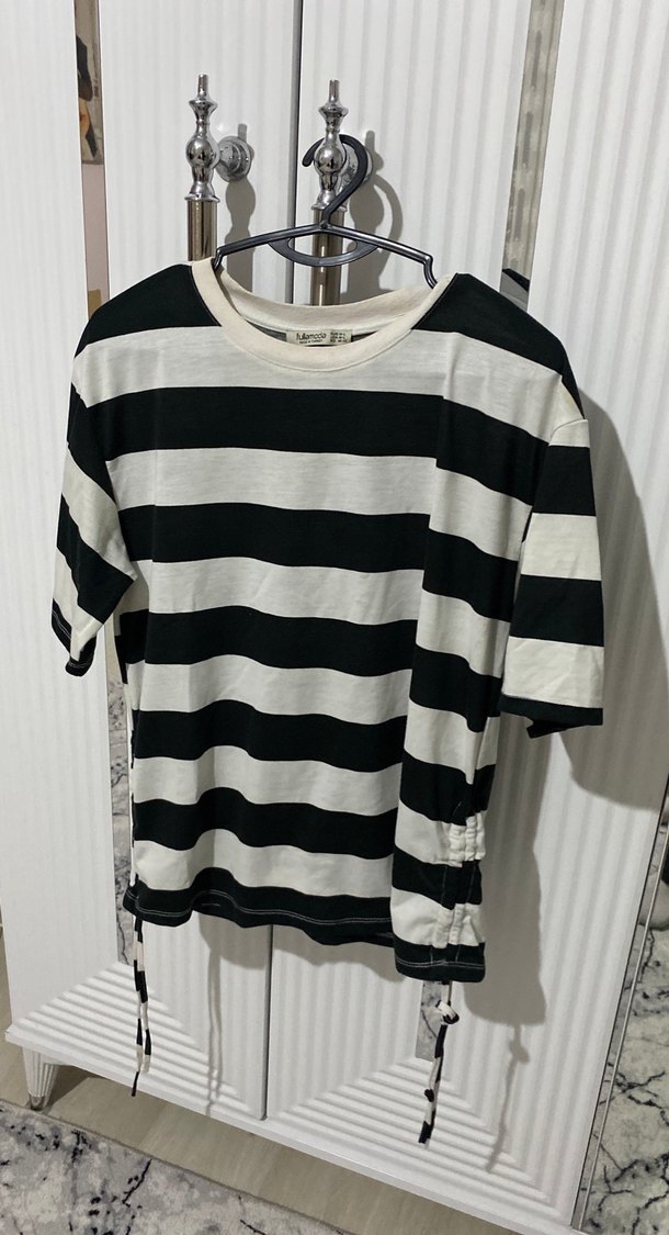 Gri ve beyaz çizgili, kısa kollu, yuvarlak yaka, pamuklu ve pile detaylı, bol kesim kadın tişörtü. Yakası lekeli gibide değil