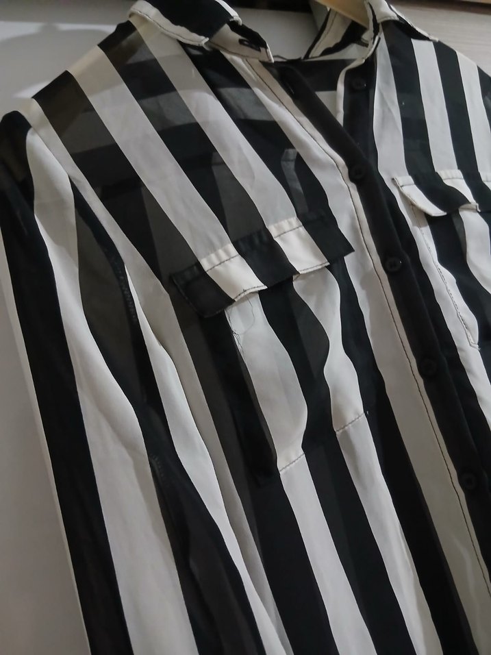 Gri-Beyaz Çizgili Kadın Uzun Gömlek