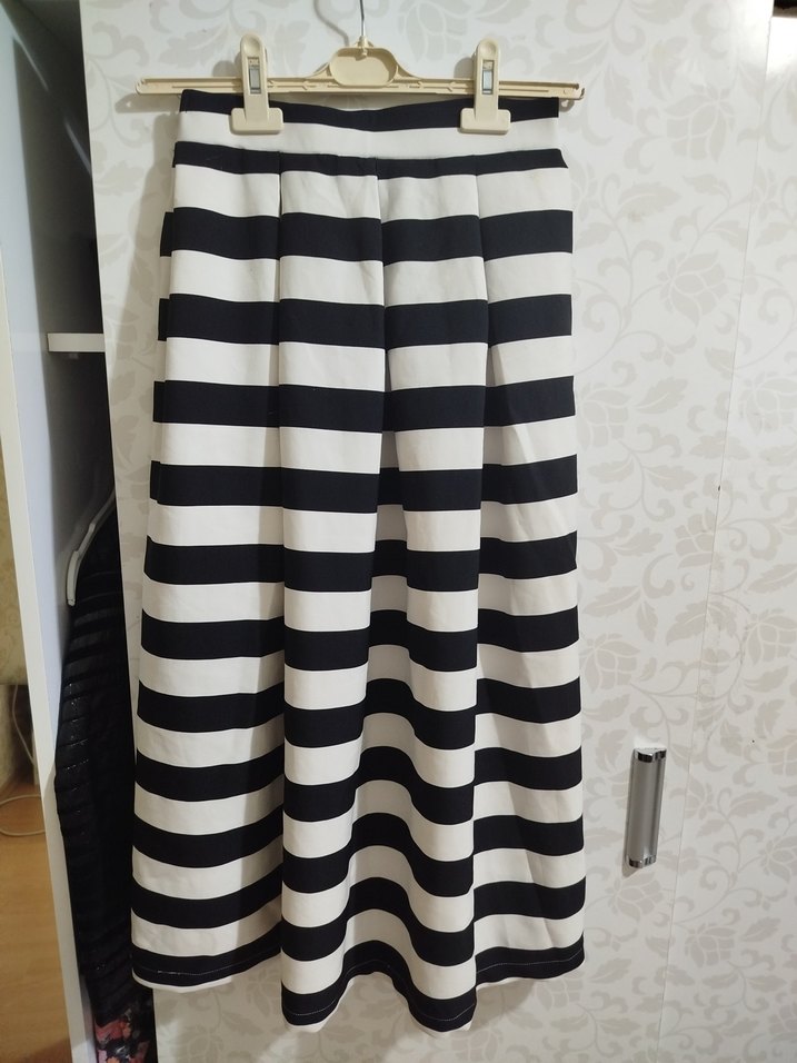 Gri ve beyaz yatay çizgili, piliseli ve bol kesim kadın uzun eteği. Sentetik kumaştan üretilmiş, Paris tarzı sokak modasına uygun.iki kez giydim gayet temiz sorunu yok