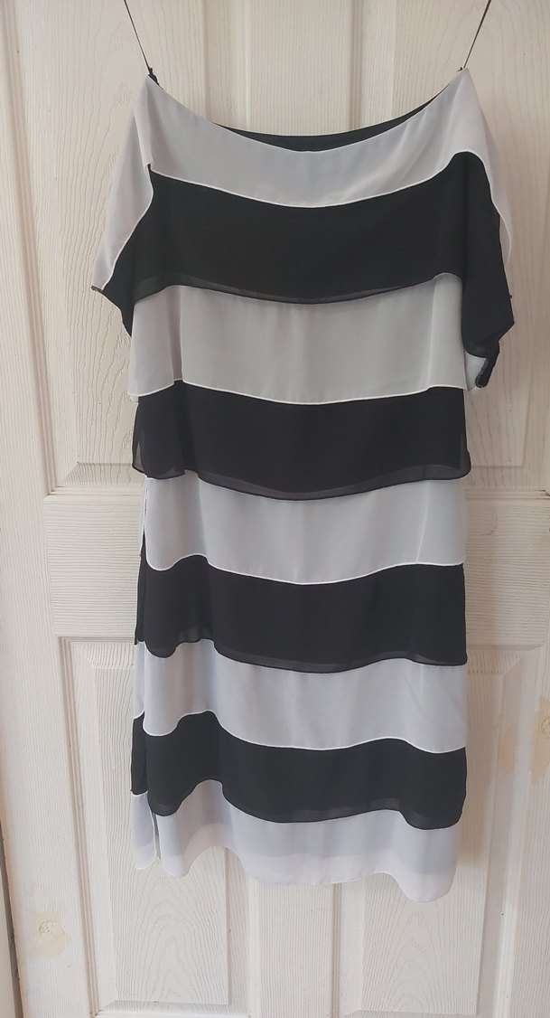 Geniş çizgili gri beyaz renklerde, kısa kollu ve tekne yakalı midi boy, bol kesim kadın elbisesi. Günlük kullanım için yumuşak sentetik kumaştan.