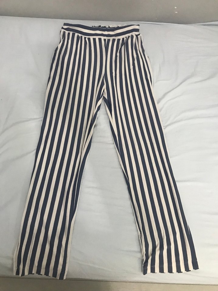 Gri ve beyaz dikey çizgili, pileli detaylara sahip normal boy regular fit kadın kumaş pantolon. Günlük rahat kullanım için uygundur.