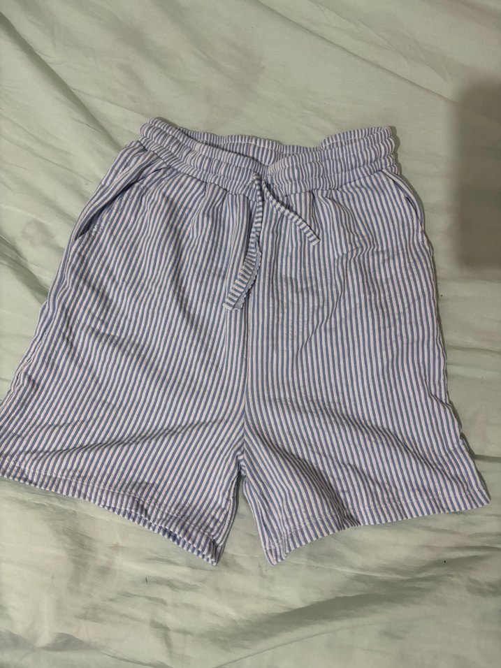 Gri beyaz çizgili, pilili ve rahat pamuklu kumaştan yapılmış bol kesim kadın şort. Günlük rahat kullanım için uygundur.