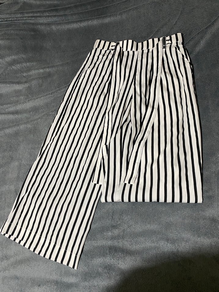 Gri ve beyaz çizgili, pilili ve bol kesim midi pantolon, yumuşak sentetik kumaştan günlük sokak stili için uygundur.