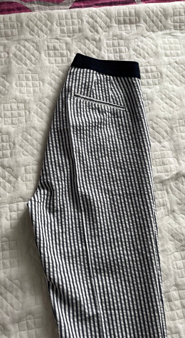 Gri beyaz çizgili, pilili ve midi boyda, regular fit kumaş kadın pantolon. Paris sokak modasına uygun, günlük kullanıma elverişli. Hiç kullanılmamıştır.