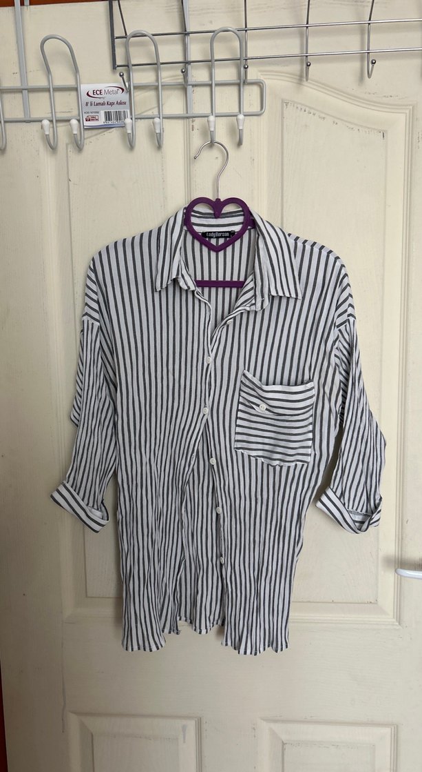 Gri ve beyaz çizgili, pamuk kumaştan yapılmış bu uzun kollu gömlek, yakalı, düğmeli ve bol kesimdir. Günlük rahat stil için uygundur.
