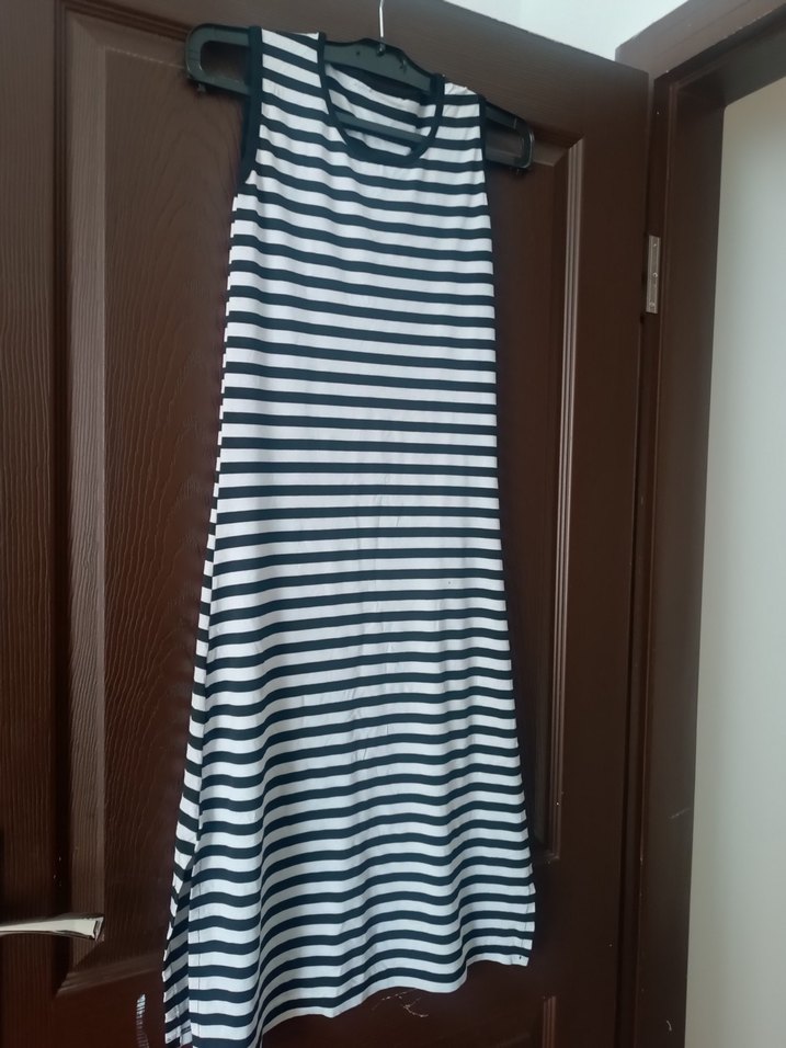 Gri beyaz çizgili, kolsuz uzun elbise. Tekne yaka ve pile detaylı, yumuşak sentetik kumaştan, rahat kesim.