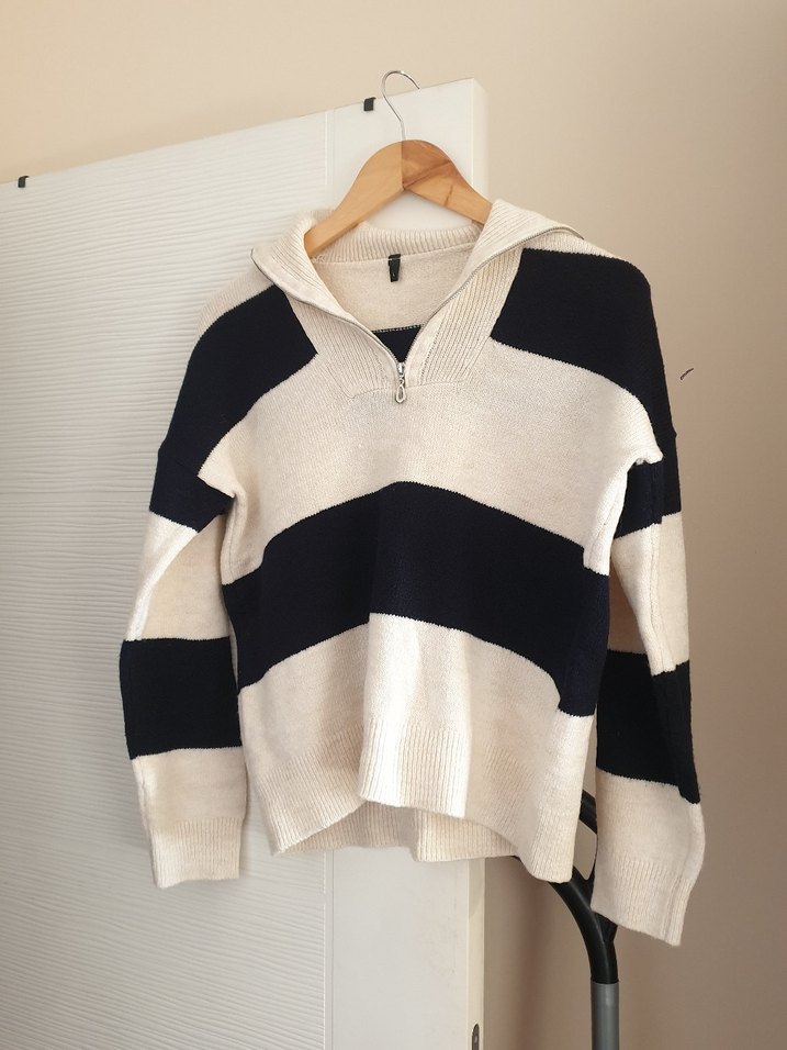 Uzun kollu, fermuarlı yüksek yakalı, bol kesim gri beyaz çizgili yünlü kadın triko. Rahat sokak stili için uygundur.