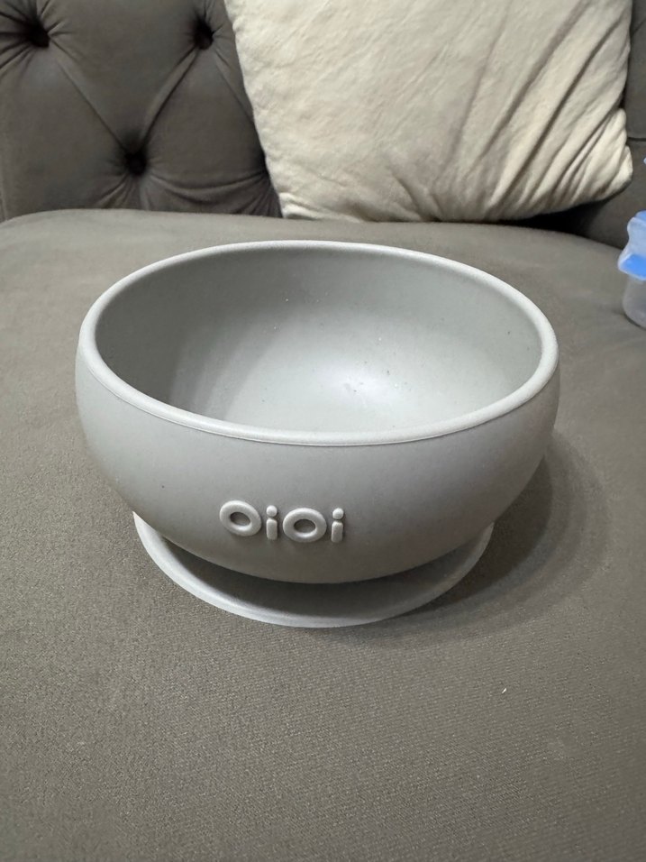 Oioi markalı gri beyaz çocuk kasesi, kaymayı önleyen emici tabana sahiptir. Kapağı yoktur