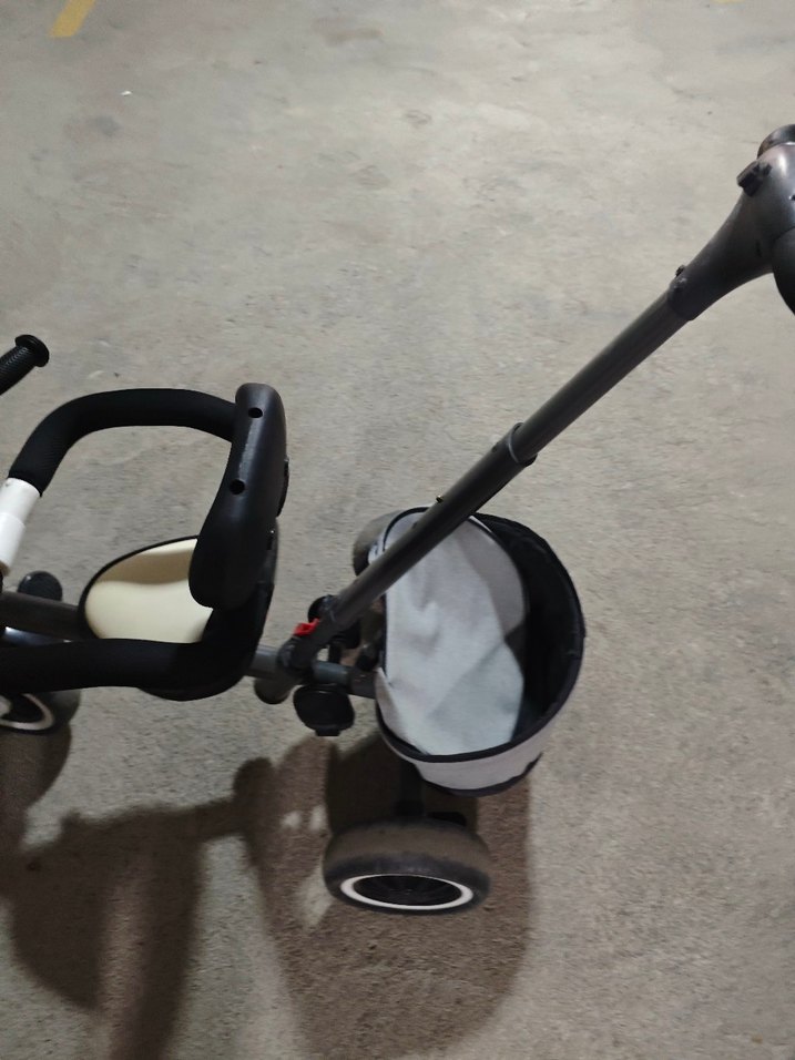 Gri ve beyaz renklerde, kolay yönlendirme için tutma kolu ve arka tarafta saklama sepeti bulunan çocuk üç tekerlekli bisiklet.