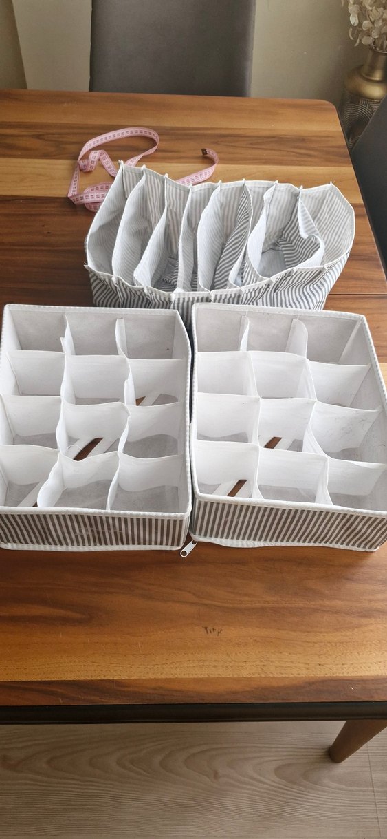 Gri ve beyaz renklerde, çok gözlü dolap düzenleyici. Yumuşak ve dayanıklı kumaştan üretilmiş, eşyaları düzenli tutar.