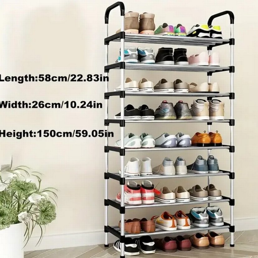 150cm yüksekliğinde, 60cm genişliğinde ve 26cm derinliğinde gri beyaz çok katlı ayakkabı rafı, geniş depolama alanı sunar.