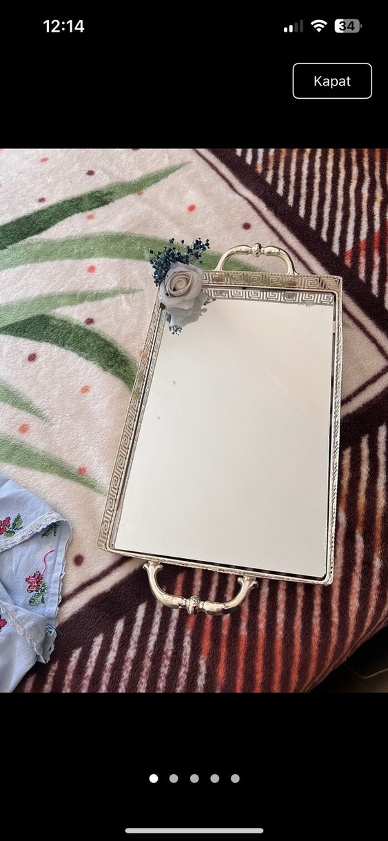 Gri beyaz dekoratif çerçeve ve kulplara sahip dikdörtgen ayna, köşesinde çiçek detaylı. #nişan #söz