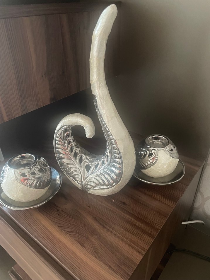 Gri ve beyaz tonlarda, pürüzsüz ve dokulu yüzeylere sahip dekoratif set
