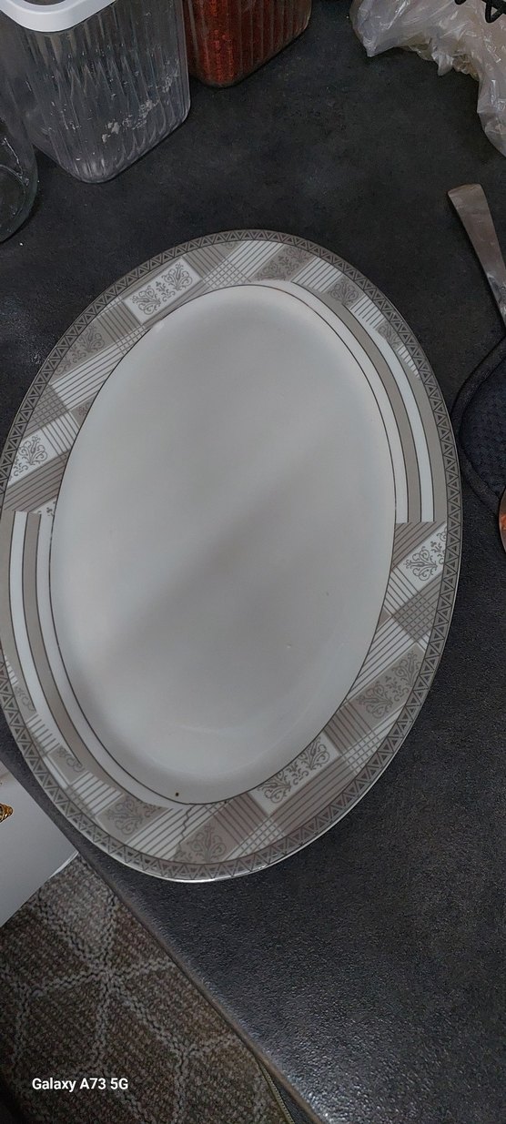 Kenarları gri ve beyaz dekoratif desenli oval servis tabağı. Klasik tasarımıyla yemek servisine uygundur. ️