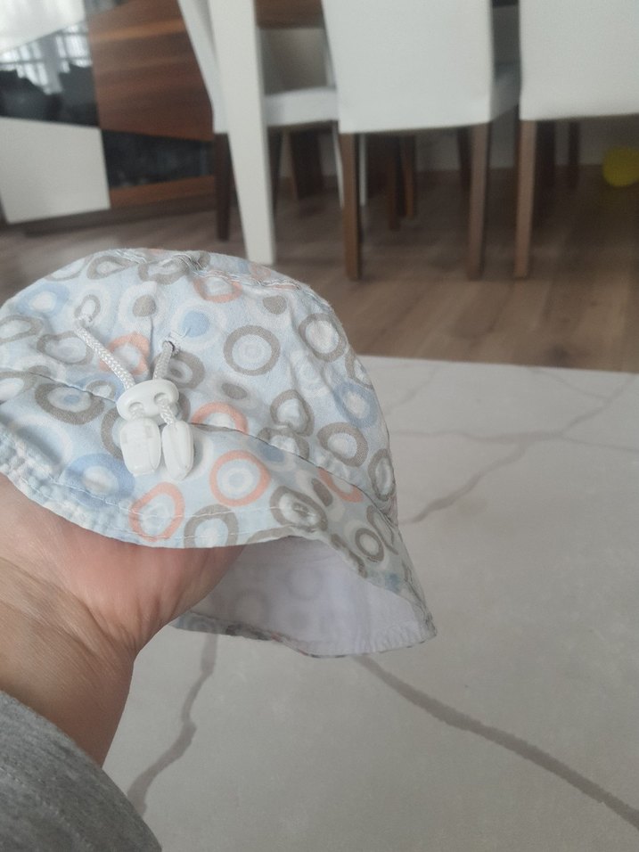 Gri ve beyaz halka desenli, ayarlanabilir ip detaylı yumuşak bebek şapkası