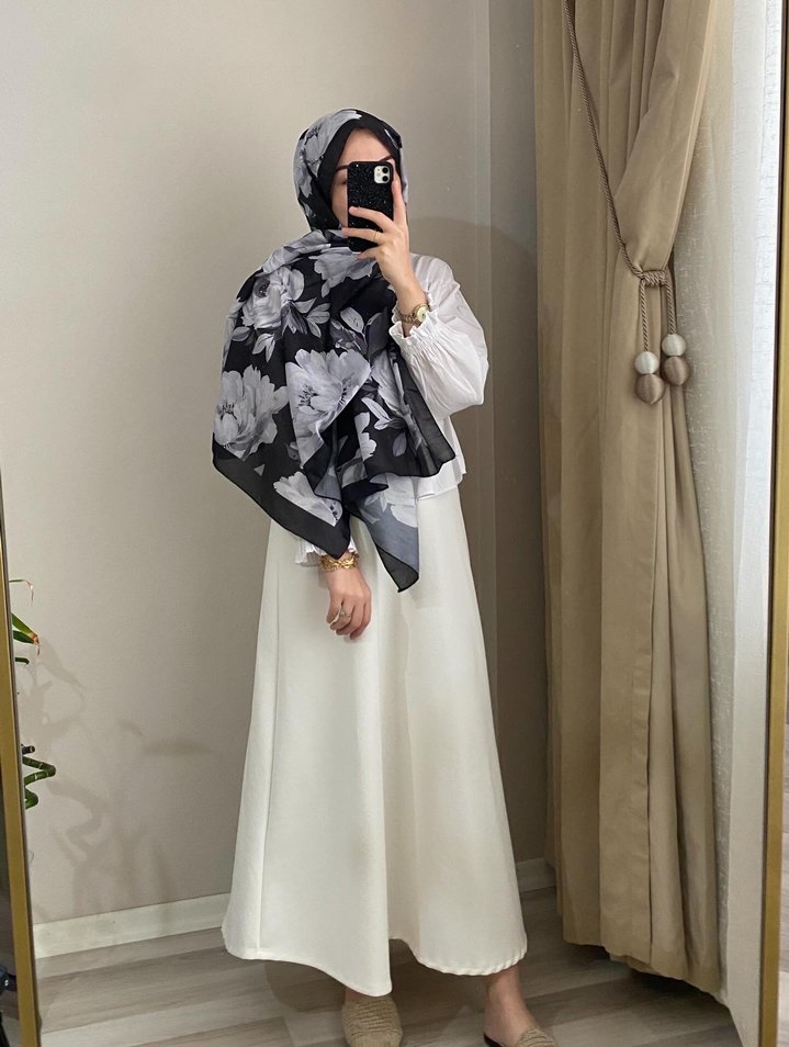 Gri ve beyaz çiçek desenli, dökümlü kadın şalı. Yumuşak sentetik kumaştan minimal sokak stili için uygun.