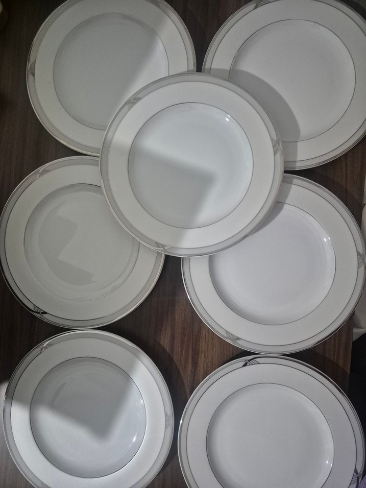 Kenarlarında gri desenler bulunan beyaz servis tabakları seti, servis için uygundur. ️