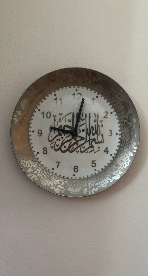 Gri ve beyaz renklerde, İslami hat sanatı bulunan duvar saati. Sayılar kolay okunabilir, dekoratif kenarlıklara sahip. ️