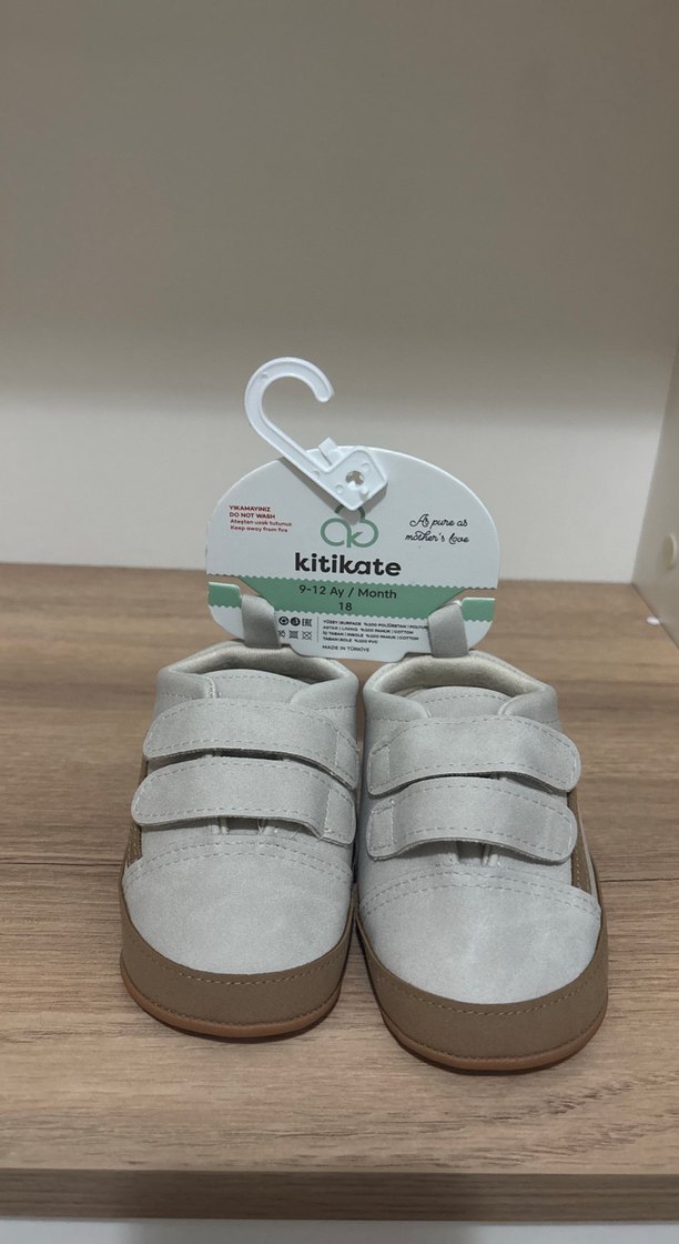 Gri ve beyaz renkli, baskılı desenli erkek bebek ilk adım ayakkabısıdır. Cırt cırtlı bantları kolay kullanım sağlar. Kauçuk tabanlıdır. Kitikate markasıdır.