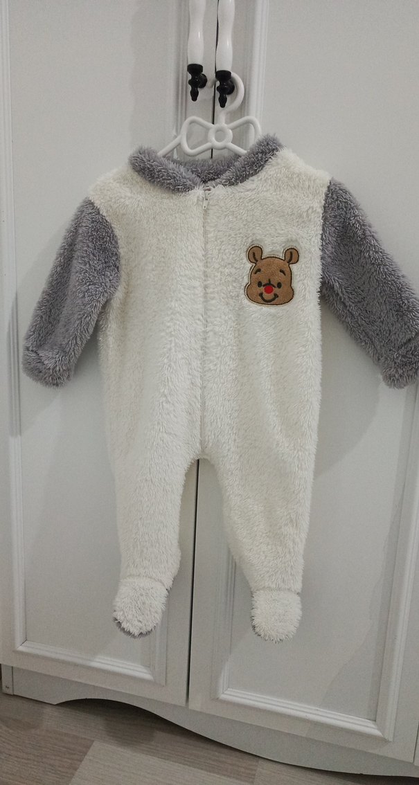 Yumuşak ve sıcak kumaş, kürk detaylı, nakışlı ayıcık desenli erkek bebek tulumu. Gri kollu, beyaz gövde, sokak stili için uygun. ❄️
