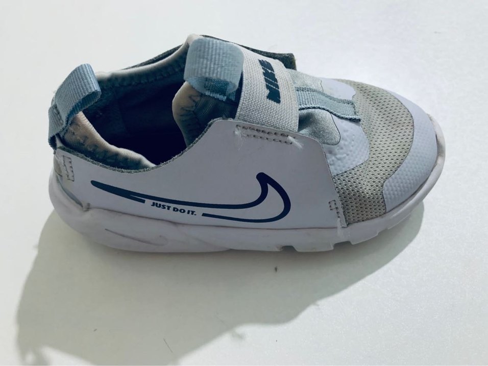 Gri ve beyaz renklerde, baskılı desenli erkek çocuk spor ayakkabısı. Kauçuk tabanlı ve cırt cırtlı kapanışıyla rahat kullanım sağlar.