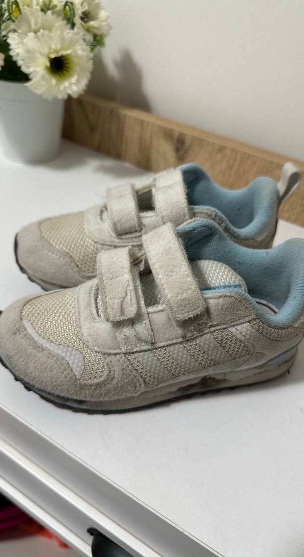 Gri ve beyaz renklerde, velcro bantlı, kauçuk tabanlı, desensiz erkek çocuk spor ayakkabısı.