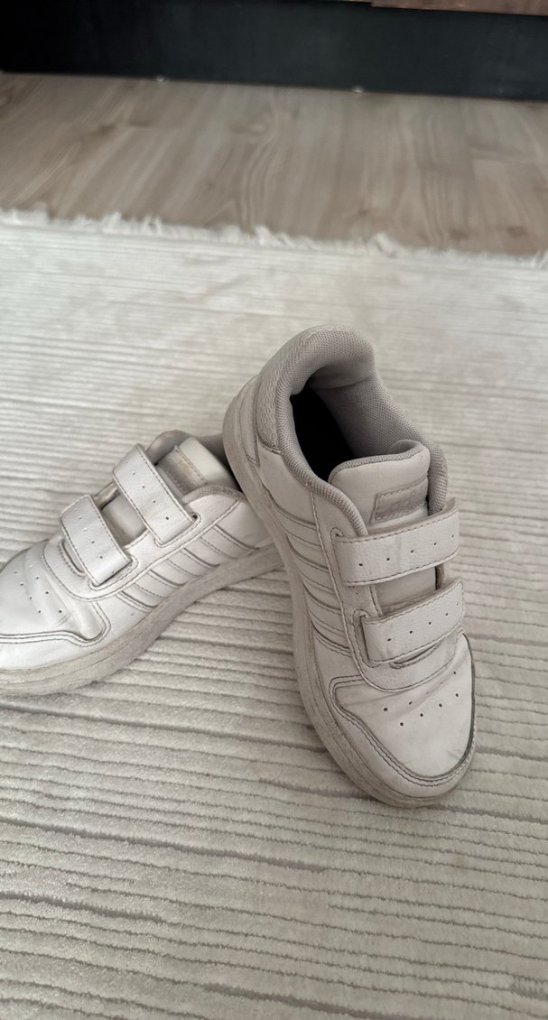 Gri beyaz renkte, cırt cırtlı ve lastik tabanlı, desen içermeyen erkek çocuk spor ayakkabısı.