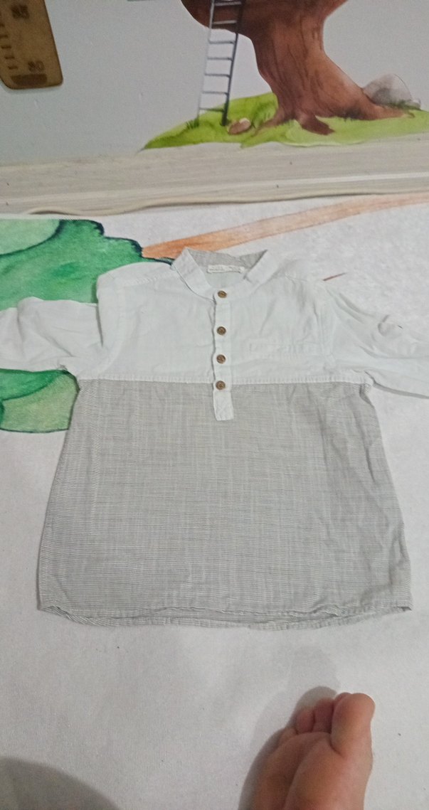 Erkek çocuk keten gömlek, bol kesim, uzun kollu ve yakalıdır. Düğmeli önü ve gri-beyaz iki tonlu bohem tarzı bulunur.