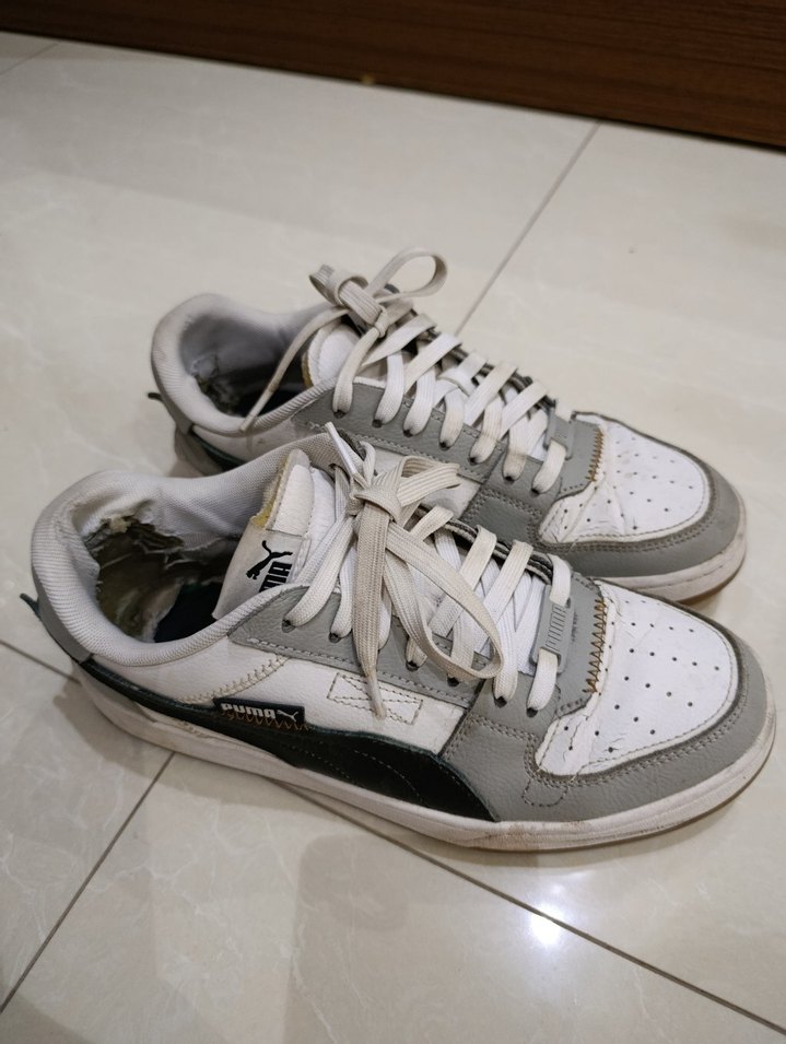 Gri ve beyaz renklerde, lastik tabanlı ve cırt cırt detaylı kadın spor ayakkabısı. İnce topuklu ve şık, spor ve günlük kullanıma uygun.