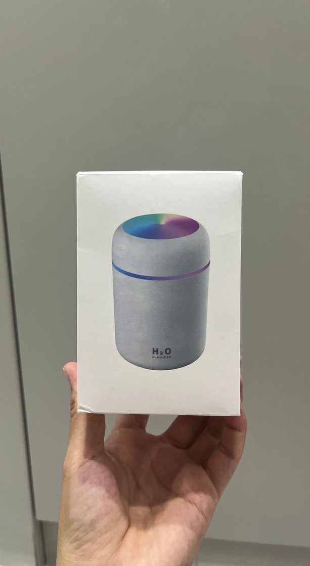 Gri beyaz renkte, renkli LED üst ışığı olan kompakt hava temizleyici ve nemlendiricidir. sıfır üründür