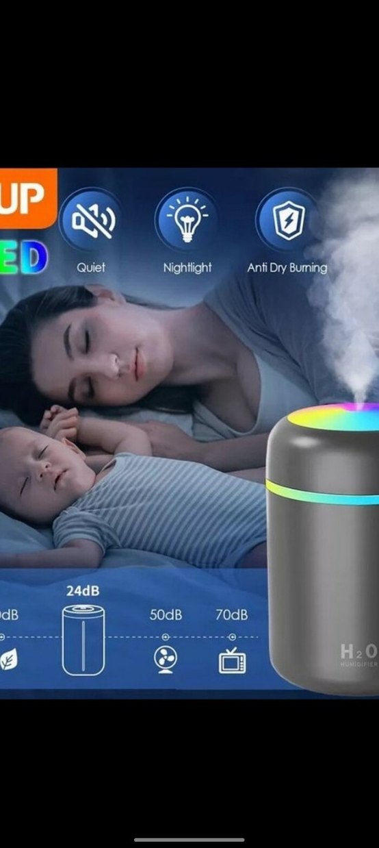 Gri H2O nemlendirici ve hava temizleyici, 24dB sessiz çalışma, gece lambası ve kuru yanmaya karşı koruma özelliklerine sahiptir.