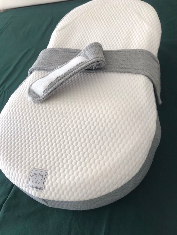 Yumuşak dokulu yüzeye ve ayarlanabilir bantla güvenli kullanım sağlayan gri-beyaz hamile ve emzirme yastığı. ️