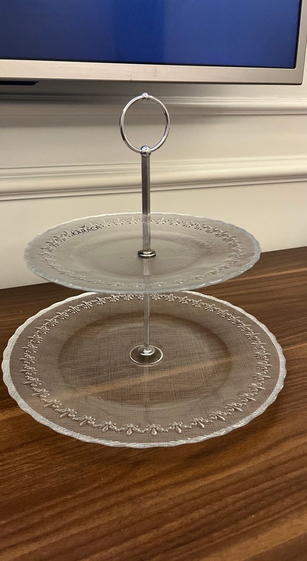 Gri ve beyaz tonlarda, kenarları ince desenli, kolay taşınan metal saplı iki katlı cam servis tabağı. ️