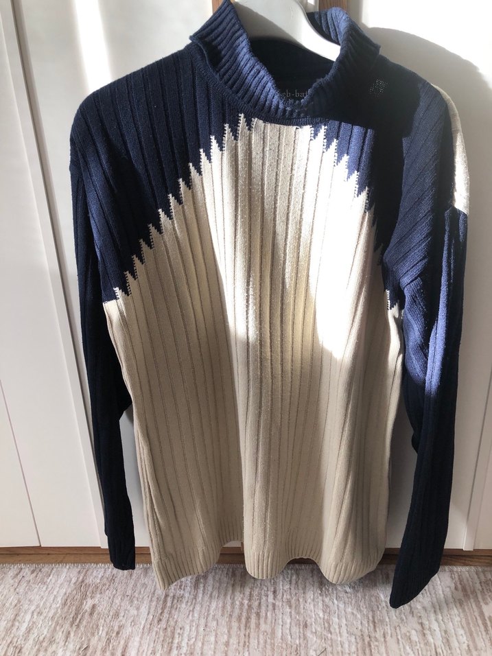 Gri ve beyaz renklerde, balıkçı yaka ve uzun kollu, triko dokulu, normcore tarzda, günlük kullanıma uygun kadın kazak.