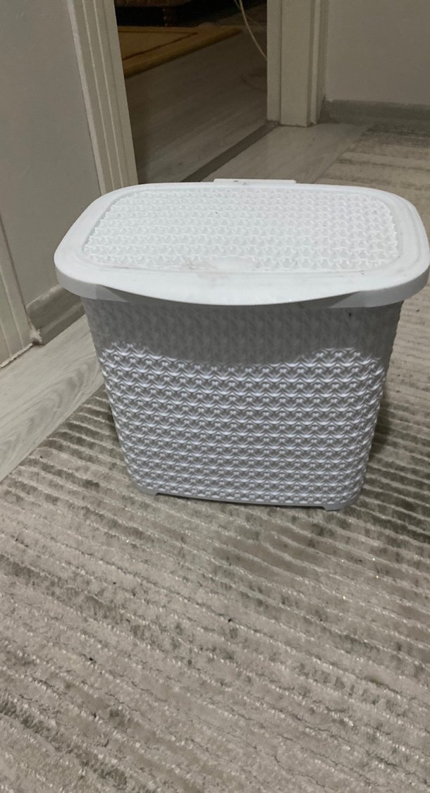 Dokulu yüzeye sahip gri beyaz saklama sepeti, beyaz kapaklı, eşyalarınızı düzenlemek için uygundur.