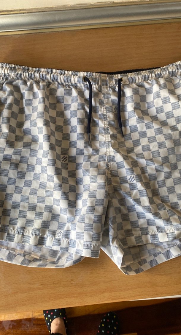 Gri ve beyaz kareli desenli, bol kesim ve düğmeli erkek midi şort, plajda bohem tarz için uygun. ️