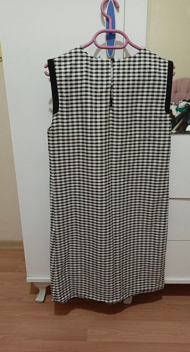 Gri beyaz kareli desenli, siyah kenarlık ve iki ön cep ile sade tasarım.midi boy. sadece önünde küçük bir leke bulunmakta. boyunu istediğiniz gibi ayarlanabilir