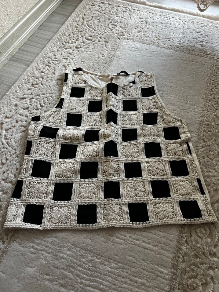 Gri ve beyaz kareli, örme kumaştan üretilmiş kolsuz bluz. Salaş kesim ve bisiklet yaka ile bohem ve rahat bir tarz sunar.