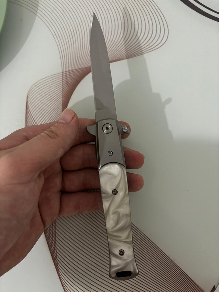Keskin bıçağa sahip katlanabilir çakı, gri ve beyaz, inci parlaklığında. Tertemiz ürün ilk açmayı fotoğraf çekerken yaptım.
