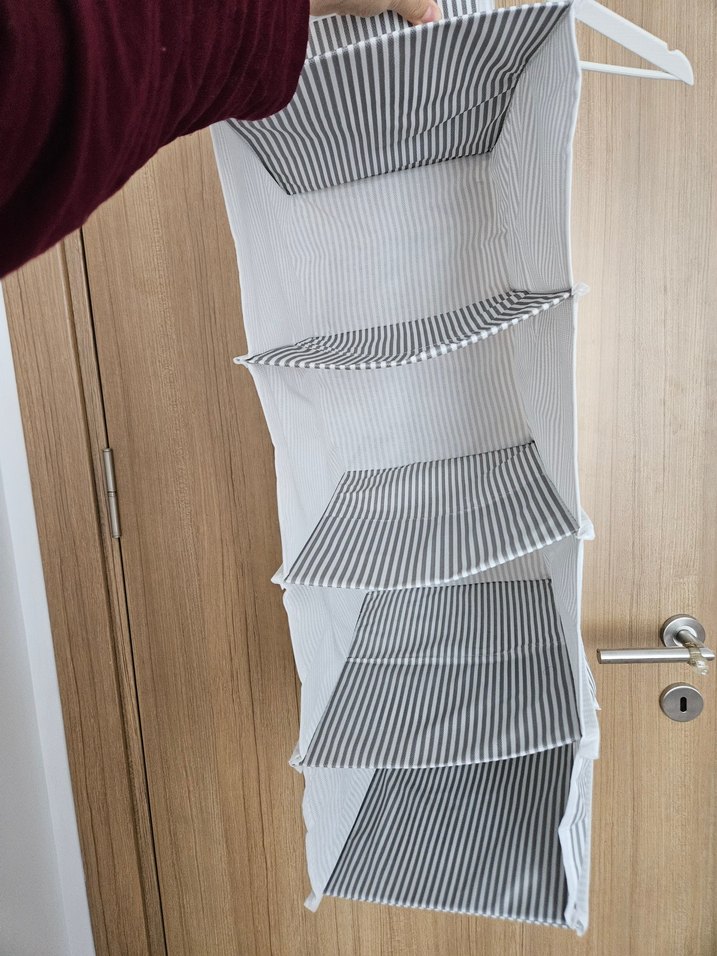 Gri ve beyaz renkli, birden fazla bölmeli katlanabilir dolap düzenleyici. Dolabınızı düzenli tutmaya yardımcı olur.