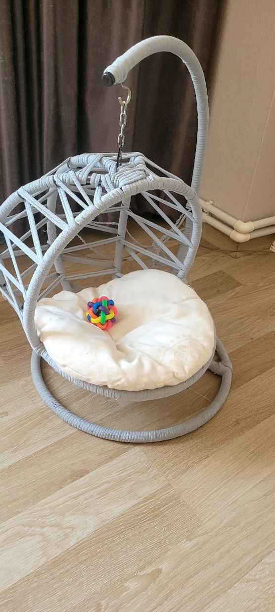 Gri ve beyaz renkte kedi salıncağı, yumuşak minder ve renkli oyuncak top ile konforlu dinlenme alanı sağlar. kedim için aldım hiç kullanmadı sıfırdan farksızdır
