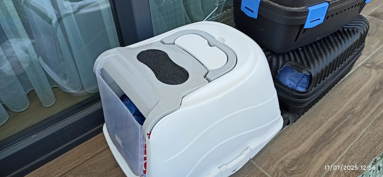 Gri ve beyaz renklerde olan bu taşıma ve tuvalet kutusu, kompakt tasarımı ve fonksiyonel bölmeleriyle evcil hayvan bakımı için uygundur.