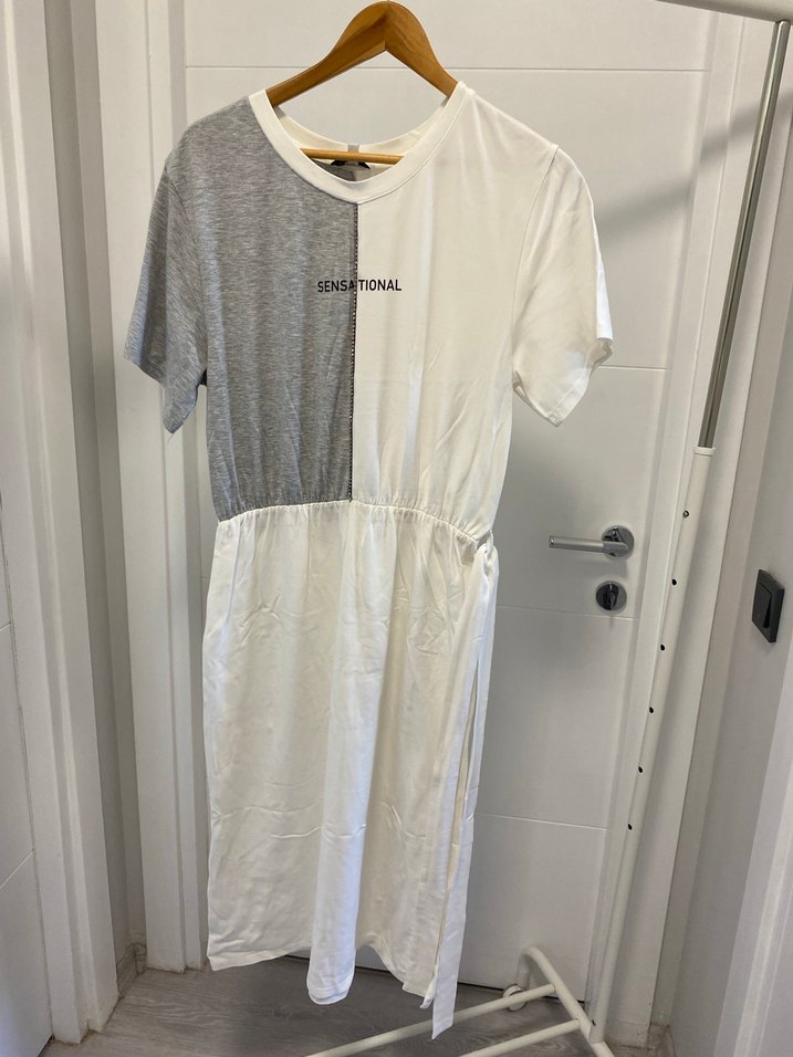 Yumuşak pamuk kumaştan, kısa kollu ve yuvarlak yakalı, salaş kesim midi elbise. Önünde "SENSATIONAL" yazısı ve kemeri ile dikkat çeker. Günlük rahat kullanım için uygundur.